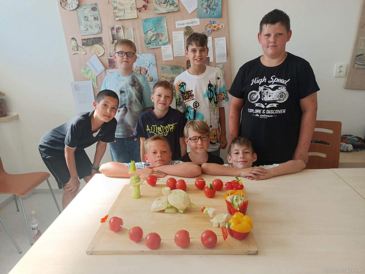Ve školní kuchyňce se rozdělili do dvou skupinek. Děvčata si zvolila za cíl ztvárnit žirafu a chlapci vytvořili hned dvě želvy i s propracovanou zeleninovou zahrádkou. K dispozici měli papriky, okurky, rajčata a kedlubny – a právě z těchto surovin pod jejich šikovnýma rukama vznikla skutečně povedená „zvířátka“.